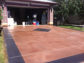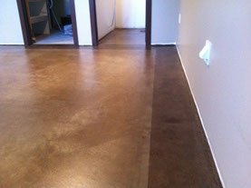 Acid Stain is not a paint or coating agent, rather, it's a coloring process involving a chemical reaction on a cementitious material. A solution made with water, acid, and inorganic salts reacts with minerals already present in the concrete, the result of this reaction is color. It works very well on new or old concrete. Acid Stain is a very durable product if properly protected with sealer or wax, and it can be applied to both interiors and exteriors. What makes Acid Stain so attractive? Acid Stain gives concrete a mottled, variegated, marble like look. It creates beautiful colors on concrete, mostly earth tone browns, reddish browns and greens. We can also create unique shades by mixing and matching colors, or applying them at different rates. Never expect Acid Stain to be uniform or have an even tone, you'll get different reactions from slab to slab, and even on the same job you may see different coloration patterns. Acid Stain can be applied to walks, entrances, driveways, living rooms, bathrooms, patios, high traffic areas and even vertically to any cementitious surface On some applications where the surface is textured, as in stamped concrete or stamped overlays, Acid Stain provides even more depth of color, larger selection and realistic look to the surface. You can go from a simple design to a very sophisticated project. The more complicated your design, the more labor intensive it will become but the end results are simply stunning. After the Acid Stain is applied, the floor should be sealed and or waxed to protect the stain and add shine and depth.